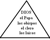 Dios, logicamente, está en la cuspide de la piramide. Debajo de El, las autoridades visibles - las "estructuras de poder" - de la Iglesia: le jerarquia, el clero; y ellos - en el ultimo lugar, el laicado cristiano.