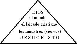 Quizas podemos ilustrar esto con otro esquema hecho sobre esta nueva premisa: Cristo es el siervo de todos; sirve a la Iglesia - clerigos y seglares - y, por medio de ella, sirve al mundo, en una misión de servicio que es salvadora. Sobre esta base construimos una piramide, no de "poder" sino de servicio: